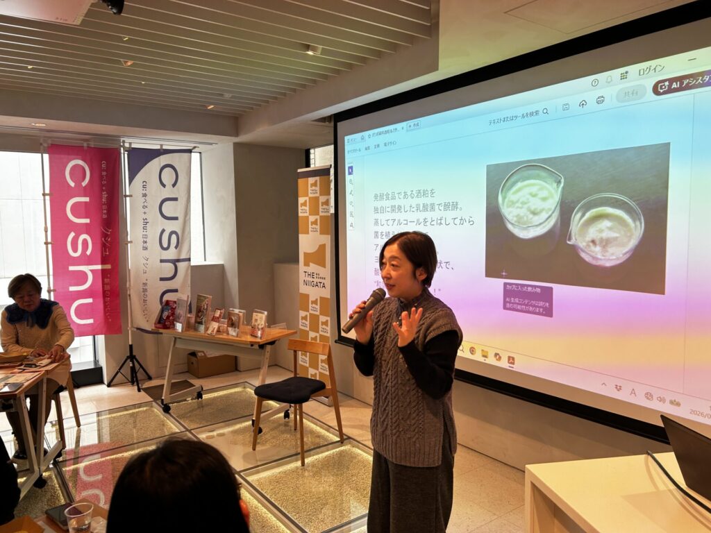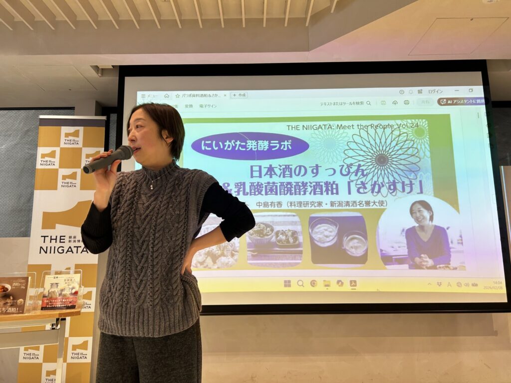 2026(令和8)年2月8日(日)、銀座・新潟情報館 THE NIIGATAにて、料理研究家で利き酒師、新潟清酒名誉大使の中島有香さんをゲストに迎え、新潟の酒粕をテーマにしたイベント「にいがた発酵ラボ 日本酒のすっぴん 酒粕&乳酸菌発酵酒粕『さかすけ』」を開催しました。