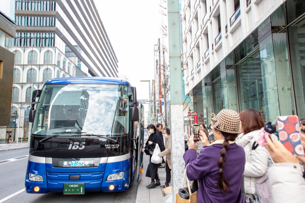 銀座の中央通りからバスに乗り込み、いざ出発!車内が和気あいあいとした活気に包まれる中、『THE NIIGATA』の高木館長による挨拶と、今回のツアーを企画・案内するハミングツアーの担当者から本日の行程説明が行われました。