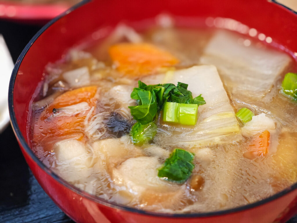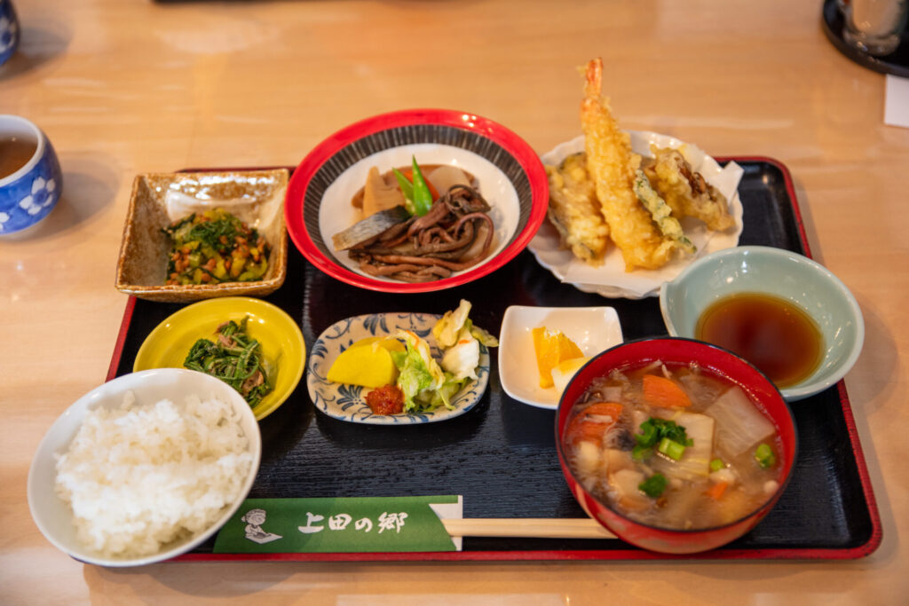 この日のおかずは、サクサクの天ぷら、地元産のぜんまいを使った煮物、神楽南蛮みそ、南魚沼の郷土料理「きりざい」(高菜・たくあん・納豆を和えたもの)、季節野菜の小鉢、そして具だくさんのけんちん汁。