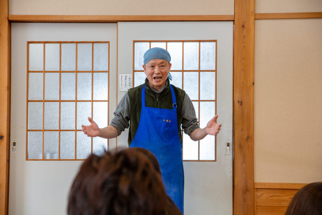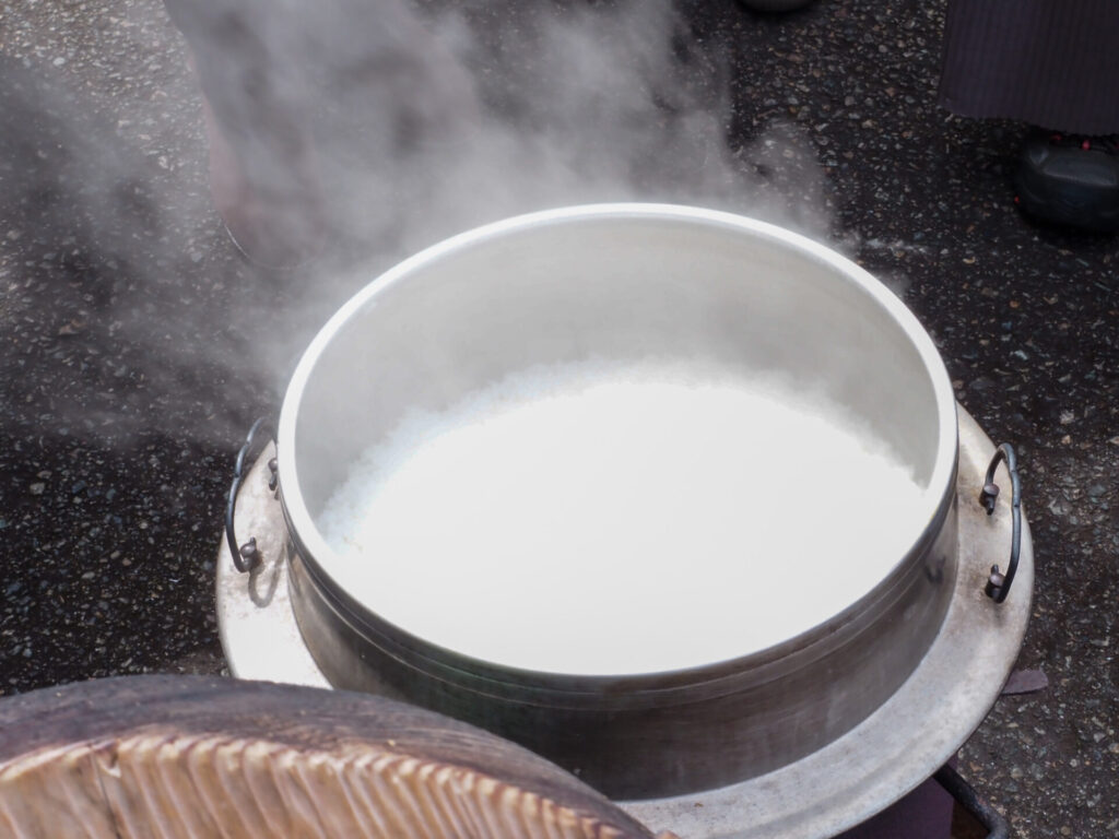 バスを降りるとさっそく、お店の方による「ぬか釜」の解説とともに、炊き立てのごはんがお披露目されました。ひんやりとした空気の中、ほっかほかの湯気がふわりと立ち上り、参加者からは思わず感嘆の声が上がりました。