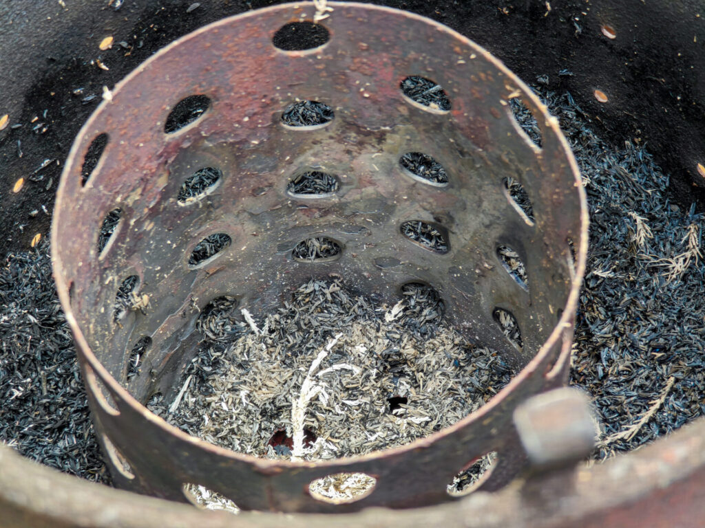 大量のもみ殻を燃料とし、わずかな火種(杉の葉など)で炊き上げる伝統的な炊飯道具です。ドラム缶のような形をした二重構造の外筒・内筒が特徴。もみが燃える速度と空気の対流を活かすことで、美味しく炊ける火加減「はじめチョロチョロ、なかパッパ」の状態を、なんと自動で調整できる仕組みになっています。