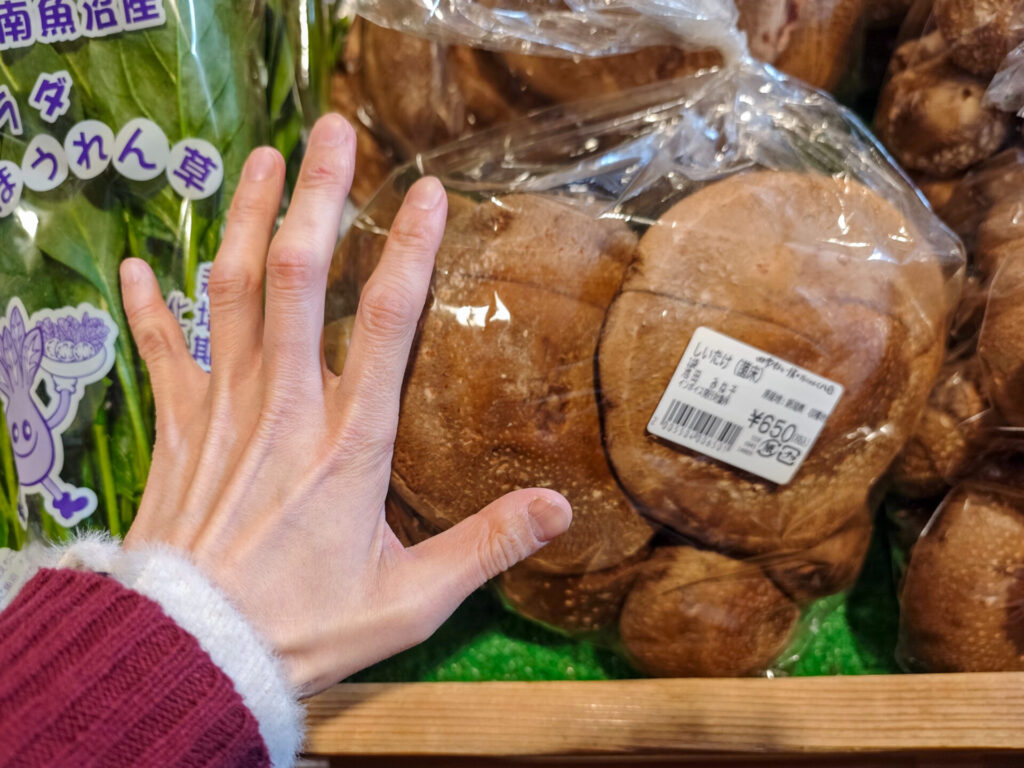 入口を入ってすぐに目に留まったのは、手のひらほどもある大きなしいたけ!袋にぎっしりと詰め込まれたそのボリューム感に、「これは掘り出し物!」と、思わずカゴに入れてしまいました。