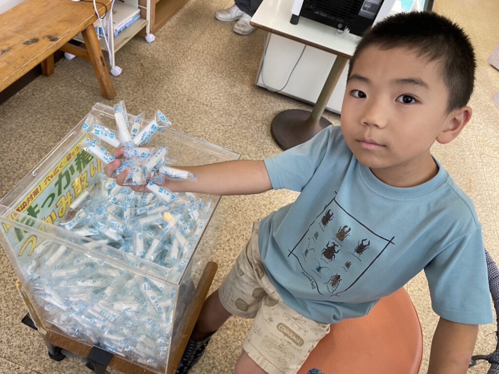 個包装のはっか棒がたっぷり入った箱に、片手を入れてチャレンジ。つかんだ分はそのままお持ち帰りいただけます。