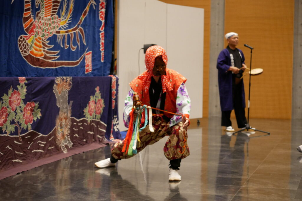 舞方と地方(じかた)で演じ、地方は、うちわ太鼓を腰につけ、細いバチで叩きながら唄う。
