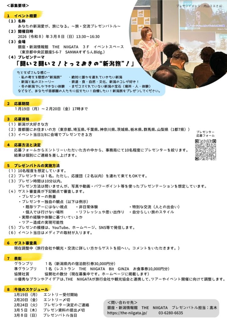 | このイベントの問い合わせ先 | 銀座・新潟情報館 THE NIIGATA プレゼンバトル担当:髙木 電話:03-6280-6635 |