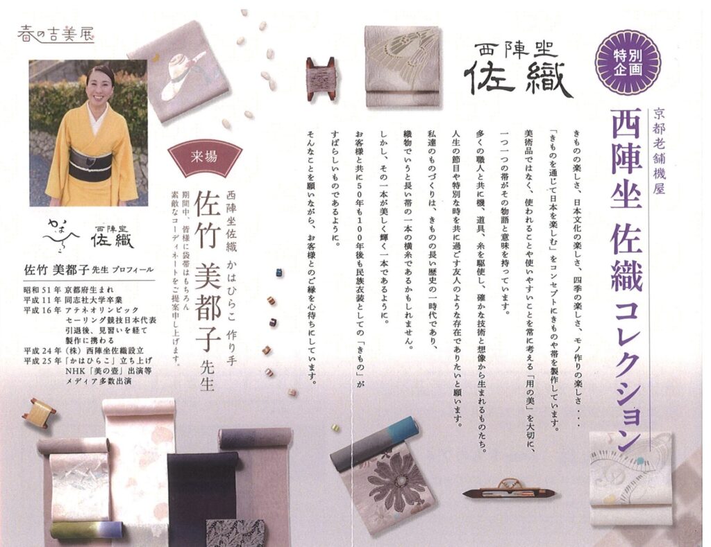 新潟県の染織作品にあわせて、「西陣坐 佐織」の素敵な着物をご提案いたします。期間中は佐竹美都子先生が来場され、お客様一人ひとりにコーディネートをご提案申し上げます。