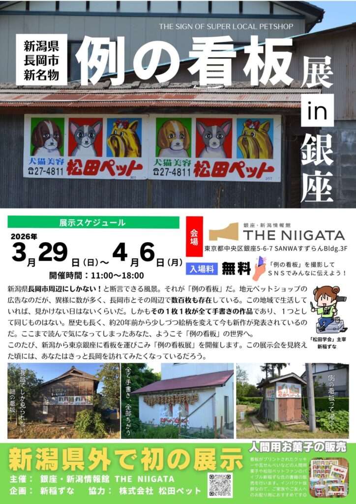 | 主催 | 銀座・新潟情報館 THE NIIGATA (企画:新稲ずな/協力:株式会社 松田ペット<https://www.matsuda-pet.jp/>) |