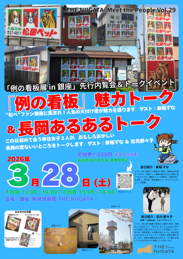 | イベント名 | 「例の看板展 in 銀座」先行内覧会&トークイベント / THE NIIGATA: Meet the People Vol.29 |